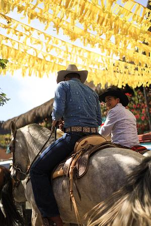 Two young men riding horses in the town square in Sayulita, Nayarit, Mexico